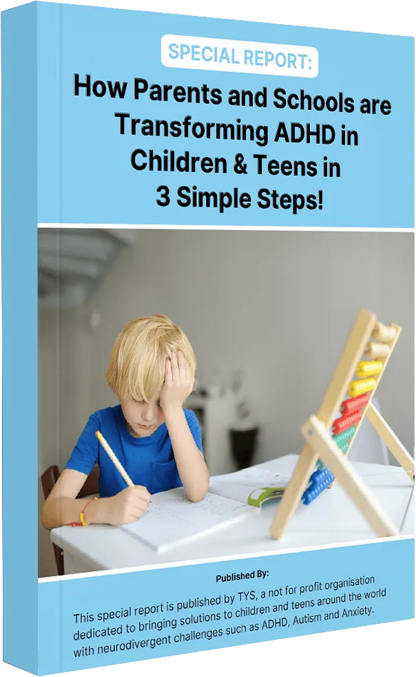 This FREE special report (no credit card required) is published by TYS, a not for profit organisation dedicating to bringing solutions to children and teens around the world with neurodivergent challenges such as ADHD, Autism and Anxiety.